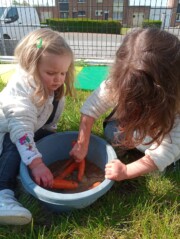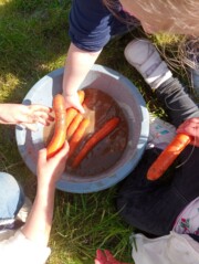 Encore plus drôle ?! Mettre les pièces dans la fente pour libérer les carottes ! Pour ensuite les laver au soleil les découper et les déguster !