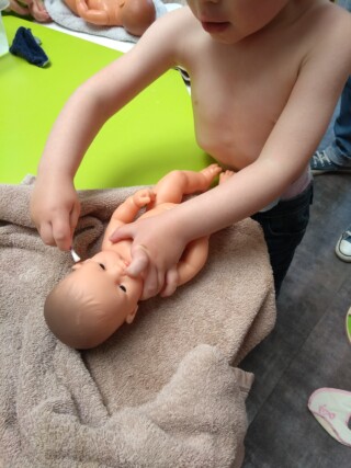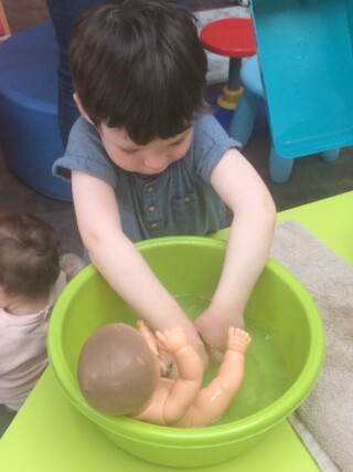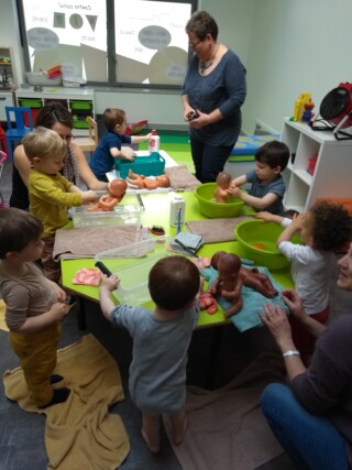 Les enfants du RAM ont toujours l’opportunité de jouer à faire la cuisine, mettre la poupée au lit, jouer au docteur… Et ce vendredi, nous avons donner le bain aux bébés ! Chacun a choisi sa poupée et en a pris soin !