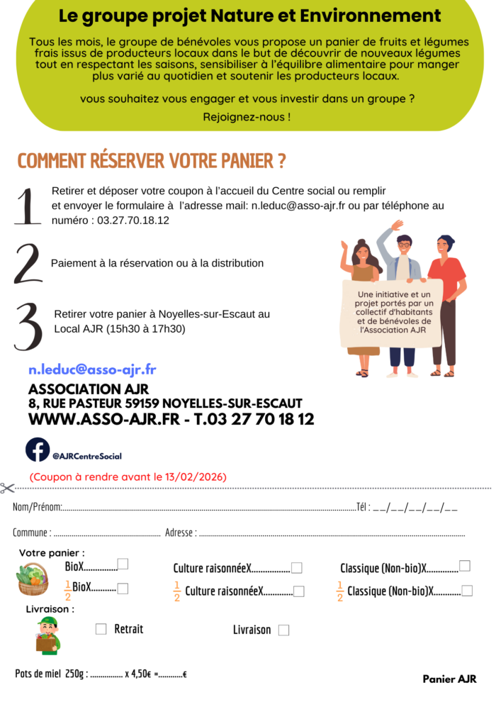 Commande avant le 13 février avec le coupon à l’accueil de l’AJR ou téléchargeable ci-dessous. | Retrait des paniers le jeudi 19 février au local AJR de Noyelles de 15h30 à 17h30 ou possibilité de livraison pour les personnes non mobiles.