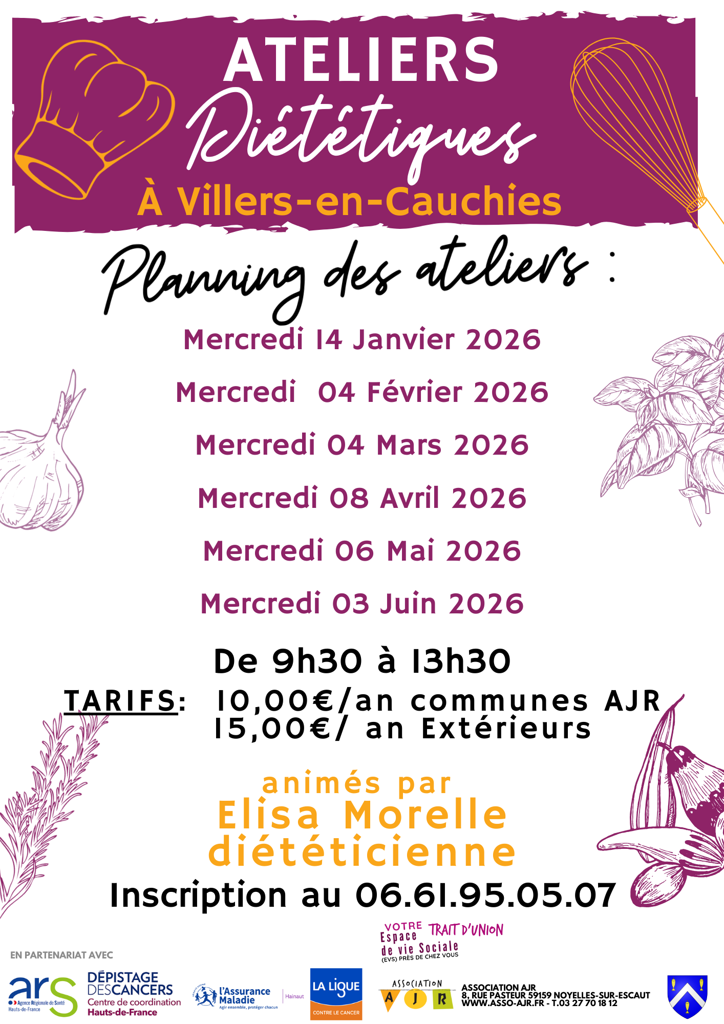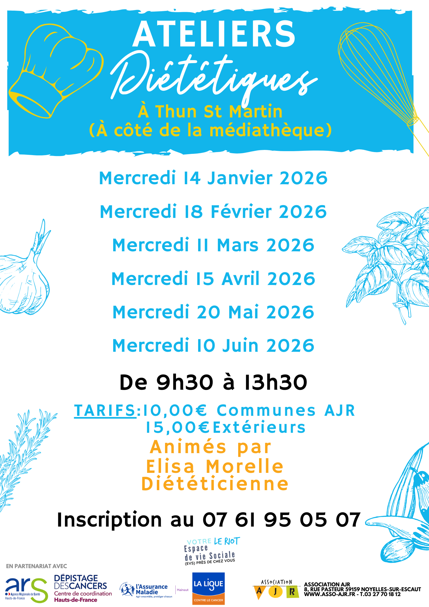 Animés par une diététicienne les ateliers cuisines permettent aux participants d’adopter de nouvelles pratiques et habitudes alimentaires en fonction de ses besoins physiologiques.Informations et conseils. Réalisation d’un menu à chaque séance.