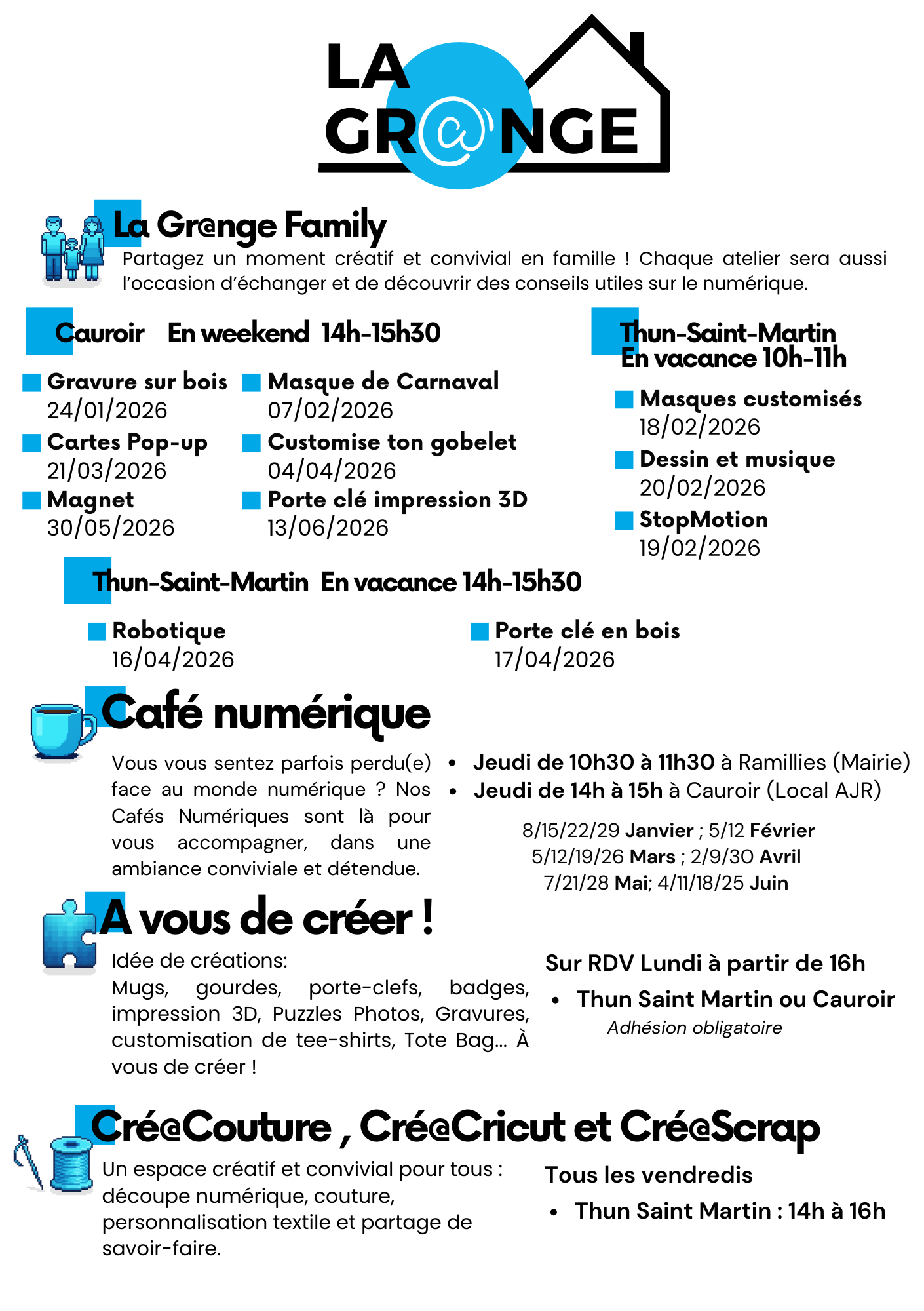 Portés par l’association AJR, le Studio AJR et la Gr@nge sont deux tiers-lieux engagés dans la création, le partage et le lien social. Ouverts à toutes et tous, ils proposent des espaces d’activités culturelles, numériques et collaboratives. Ils accompagnent les habitants et les associations locales dans leurs projets, en favorisant l’entraide, l’expérimentation et le faire ensemble.