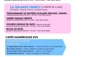 Le programme de la rentrée 2024 de l’Association AJR est enfin disponible ! Découvrez toutes les activités pour la petite enfance, les familles, les adultes, les jeunes et les seniors pour les mois de septembre à décembre. Nos espaces comme La Source, Le Riot et Le Trait d’Union vous accueillent avec une variété d’ateliers et d’événements pour tous les âges.