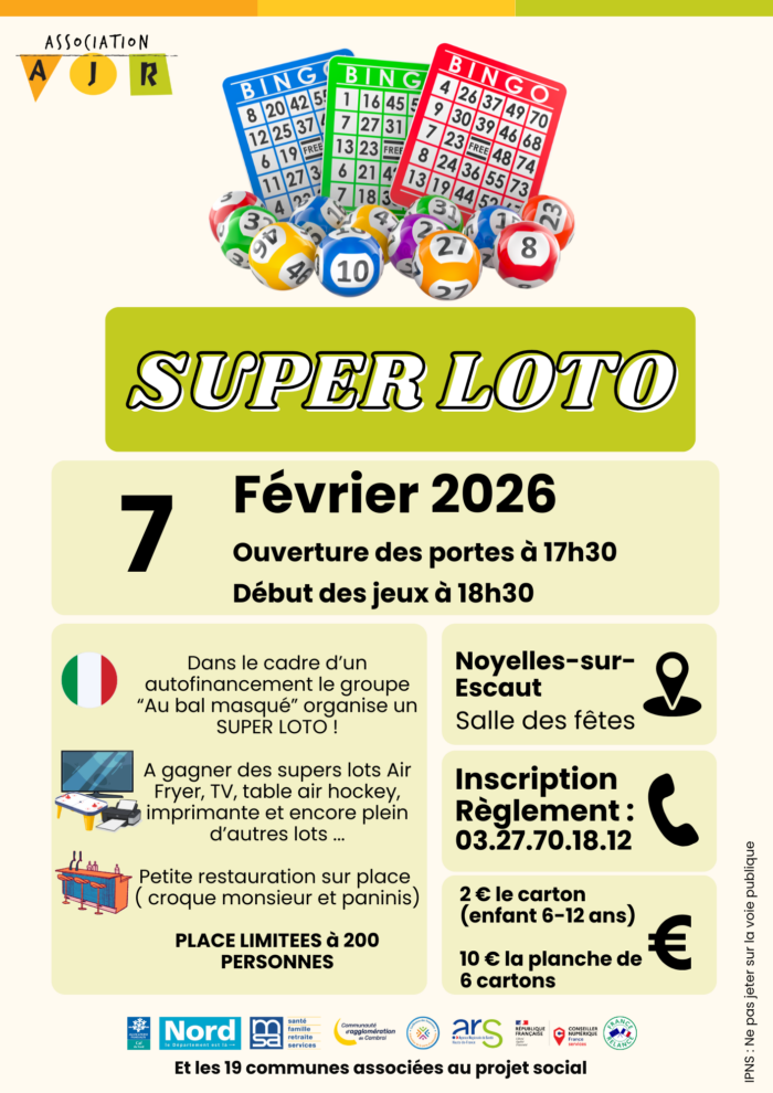Envie de passer une soirée conviviale tout en soutenant un beau projet ? Le groupe « Au bal masqué » de l’AJR vous donne rendez-vous pour un Super Loto le samedi 7 février 2026.